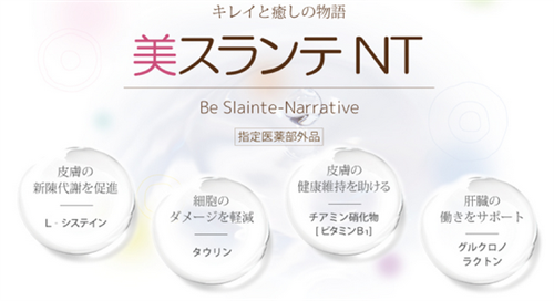 美スランテNTには、タウリン、グルクロノラクトン、L-システイン、ビタミンB1など、肌の健康をサポートするための有効成分が豊富に含まれています。