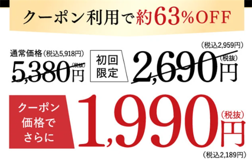 通常価格5,918円(税込)のところ、初回限定で2,959円(税込)と約63%OFFの2,189円(税込)で購入できます。