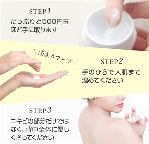 500円玉大の量を手に取り、清潔な背中に優しく塗り広げてください。