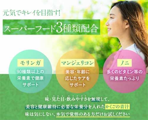 かくごの青汁は、モリンガ、ノニ、マンジェリコンといったスーパーフードを高配合しており、健康維持や美容効果に優れた商品です。