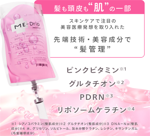 ME-Dripは濃密泡によるダメージ補修、保湿成分の配合、無添加処方など、髪と頭皮を同時にケアできるオールインワンシャンプーです。