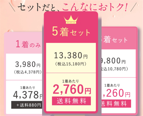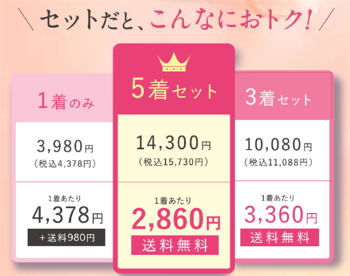 モモフルは、単品価格が4,378円(税込み)で、3着セットや5着セットで購入すると、1枚あたりの価格がさらにお得になります。