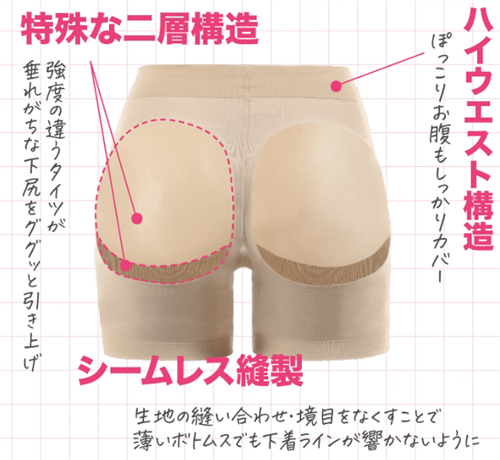 この構造は、左右からお尻をサポートしながら、中央にお肉を集めることで、自然でセクシーなヒップラインを作ります。