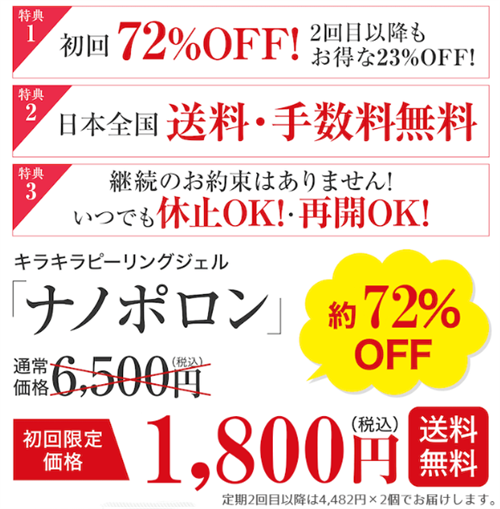 また、ナノポロンは 初回72%OFFで1,800円(税込)という手頃な価格で試せる ため、ピーリング初心者の方でも始めやすいのが魅力です。
