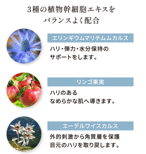 エリンギウムマリチムムカルス、リンゴ果実、エーデルワイスカルスの植物幹細胞エキスが含まれています。