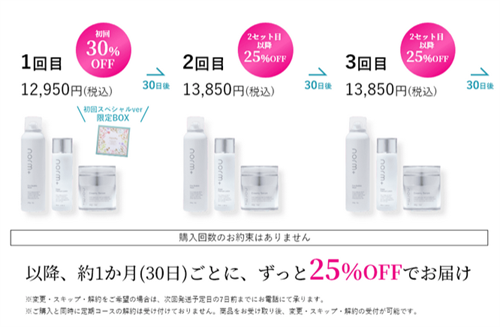 norm+のスペシャル限定BOXがとても魅力的だと感じました。初回30%オフで購入できる上に、2回目以降も25%オフというのは非常にお得ですね。さらに、初回解約が可能という柔軟なシステムも試してみるには安心です。ムース洗顔やとろみのある化粧水、そしてクリーム状美容液がセットになっているので、ストレスフリーなお手入れができるのも嬉しいポイントです。実際に使ってみたくなる口コミで、使用感が気になります。