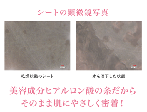ヒアルロン酸シート ピンクベアは、ナノファイバーシートの使用により、肌に密着し有効成分を効率よく届けることが可能です。
