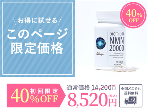 Premium NMN20000の定期コースでは、初回に40%OFFの8,520円(税込)で購入でき、さらに2回目以降も30%OFFの9,940円(税込)でお届けします。