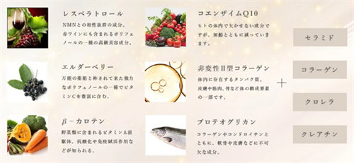 Premium NMN20000には、これら以外にもβ-カロテン、エルダーベリー、非変性II型コラーゲン、セラミド、コラーゲン、クロレラ、クレアチンなどが配合されています。
