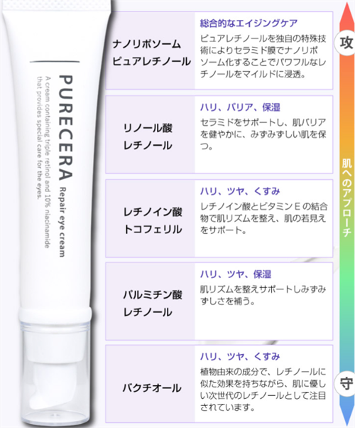 ピュアセラリペアアイクリームは、目元のケアに欠かせないレチノールとナイアシンアミドを組み合わせ、肌のハリと潤いを高めます。