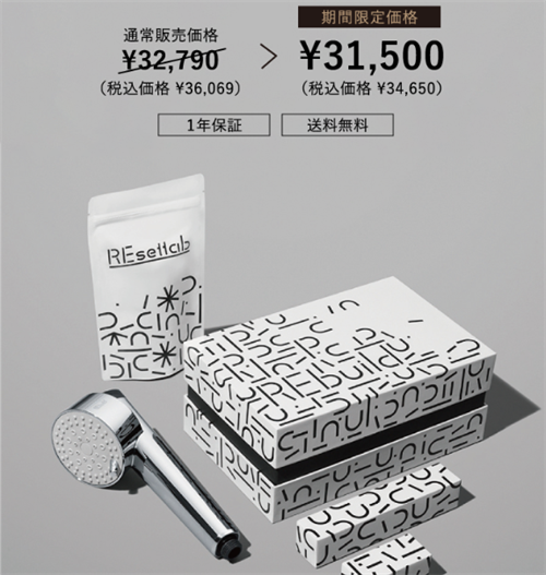 REbuild(リビルド)シャワーヘッドは、現在通常販売価格\32,790 (税込\36,069)が、期間限定で\31,500 (税込\34,650)となっています。