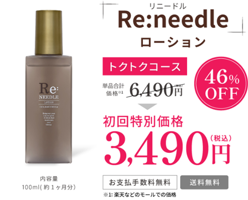 リニードル ローションは、公式サイトの「トクトクコース」から申し込むと、通常価格6,490円(税込)がなんと初回3,490円(税込・送料無料)で購入できます。