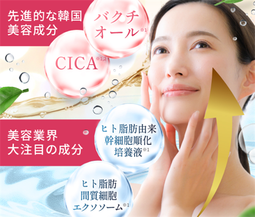 バクチオールやCICA、ヒト幹細胞順化培養液などエイジングケアに適した成分を贅沢に配合しているのも安心ポイント。