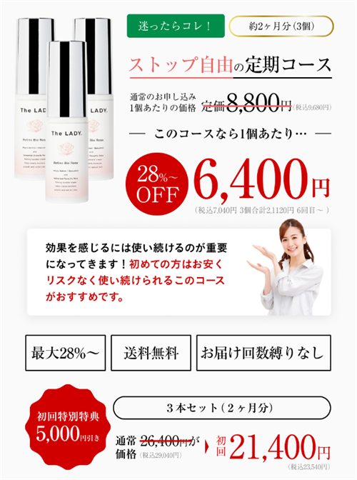 | 3本セット定期コース | 29,040円 | 23,540円 | 初回5,000円OFF, 最大28%OFF | 6回目以降2ヶ月分、1本あたり7,040円 |