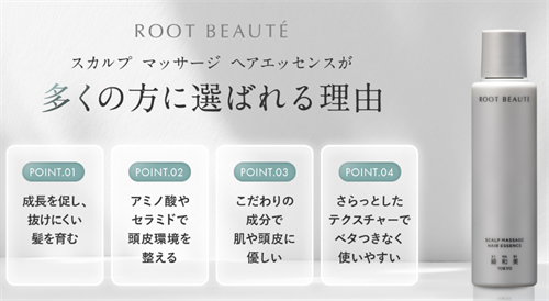 ROOT BEAUTE スカルプマッサージヘアエッセンスは、多機能なスカルプケア製品で、頭皮と髪の健康をトータルでサポートします。