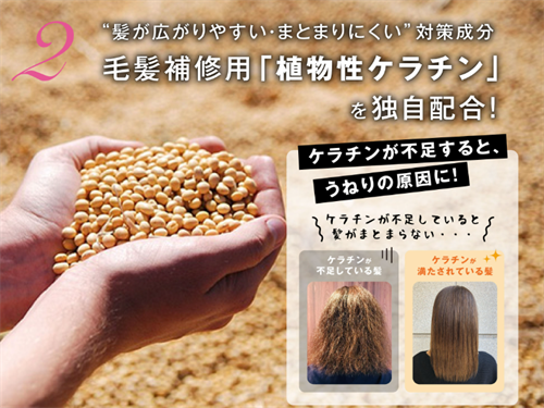 植物性ケラチンは、髪のパサつきを防ぎ、しなやかな髪質を保ちます。